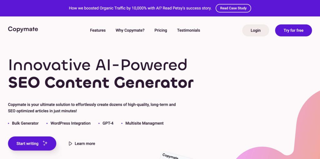 Copymate是一款由人工智能驱动的创新型SEO内容生成工具。它能让用户在短短几分钟内轻松创建数十篇高质量、长期有效的且经过SEO优化的文章,为内容创作带来极大便利。
