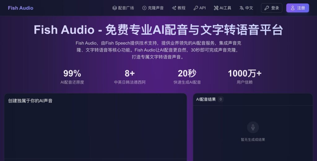 Fish Audio是由Fish Speech技术驱动的智能音频平台,专注于提供专业的AI配音解决方案。作为免费的文字转语音工具,它让普通用户也能轻松制作媲美专业工作室的语音内容,彻底改变了传统配音工作流程。