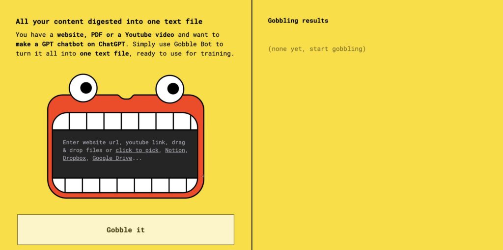 - 创建GPT聊天机器人:若用户想创建自定义ChatGPT聊天机器人,但内容来源是网站、YouTube视频或超过20个文件(当前GPT的上传限制),Gobble Bot就能将这些内容转化为可用文本,满足训练需求。