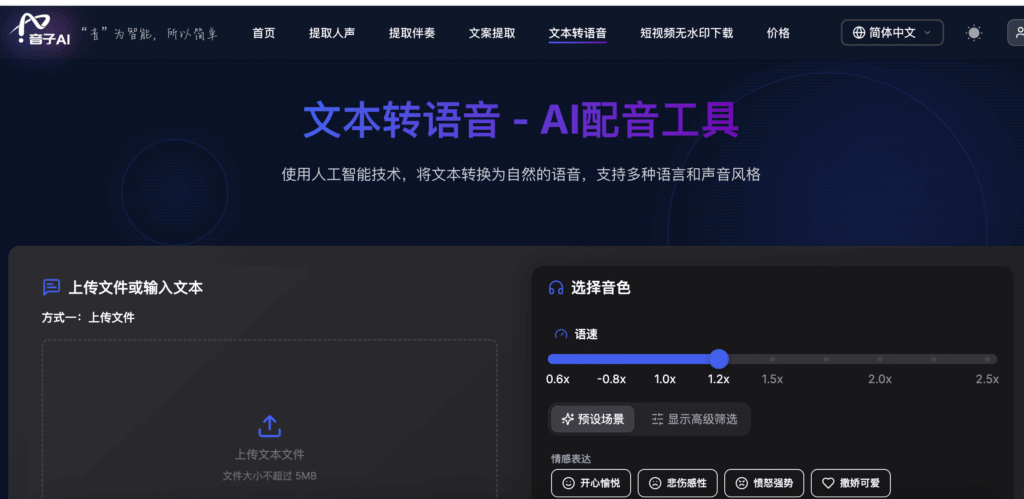 - 智能文本转语音:支持上传文本文件或直接输入文案,5MB内文件可秒级处理,实现文字到语音的高效转换。