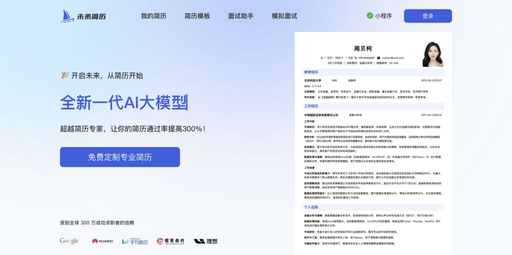 未来简历是一款全新一代AI大模型简历生成工具,受到全球300万成功求职者的信赖。它能为用户量身定制专业、高薪简历,不仅提供模板,还能像资深HR一样帮助修改简历,助力提升简历通过率。