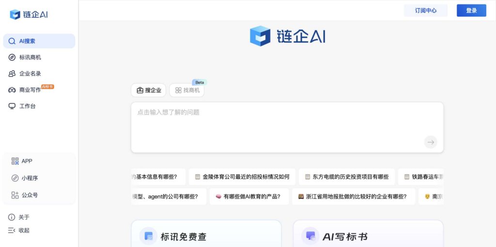 使用链企AI时,用户只需在搜索框输入想要查询的企业关键词或标书相关主题,就能快速获取所需信息和服务。