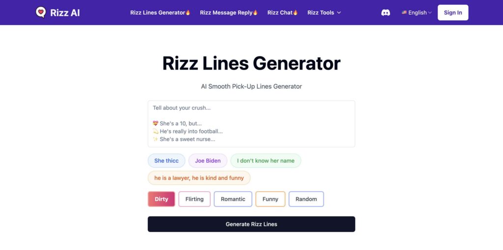 Rizz Lines AI是一款借助人工智能技术,为用户在约会交流场景中提供实用话术和创意回复的工具。它凭借智能算法,生成适配不同约会平台和情境的聊天内容,助用户在约会交流时更自信、高效地展现自身魅力,提升交流质量。