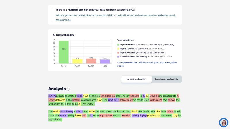 颜色标记系统:为了让用户直观地识别AI生成内容的可能性,StudyCorgi ChatGPT Detector 采用了不同颜色的标记。绿色、黄色、红色和紫色等颜色被用于标识AI通常偏好使用的单词。
